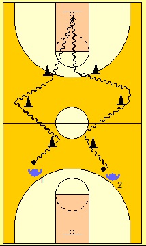 Por ello decidí cambiarlo y que cada uno saliera de un fondo y terminará en la otra canasta. Aquí, podemos quitar el zig-zag (casi velocidad pura) o cambiarlos por una escalera de coordinación. Otra buena opción es que la salida del jugador no sea desde parado. Aquí podríamos incluir un skipping, saltos delante y detrás de la línea, pisar delante y detrás de la línea...